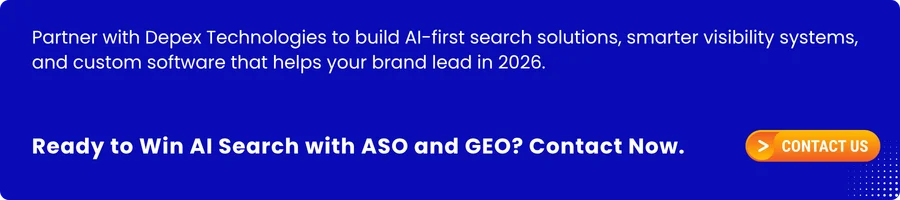 If your business wants to build AI-first search visibility, strengthen its digital authority, and develop the right software systems to support ASO and GEO at scale, now is the right time to act. Contact Depex Technologies to create search-ready platforms, intelligent content systems, AI-optimized websites, and custom software solutions built for the future of discovery. In 2026, brands do not need to choose between ASO and GEO. They need a partner that can help them execute both with precision, speed, and long-term impact. Depex Technologies is ready to help you build that advantage.